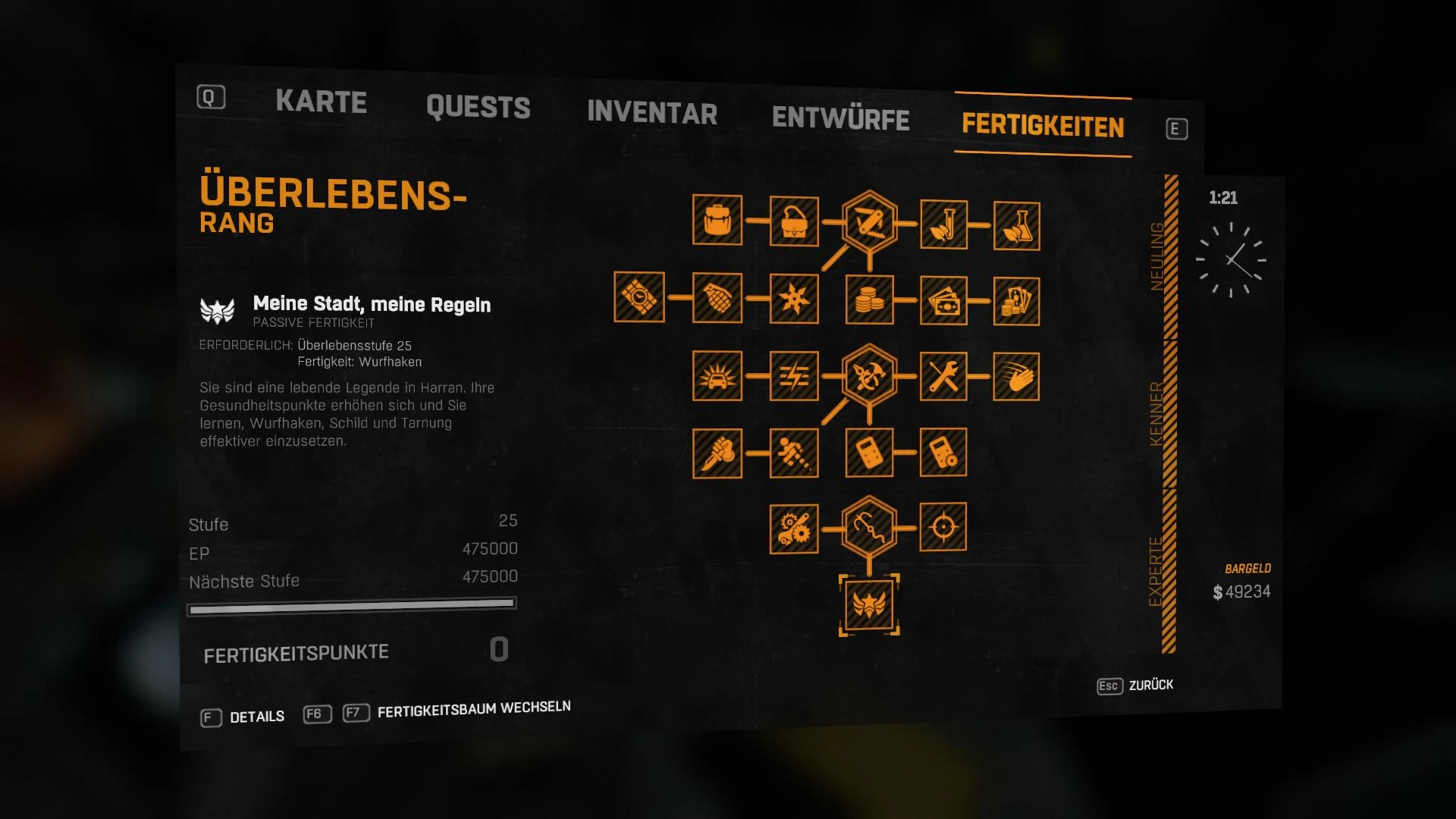 Der Überlebens-Rang ist in Dying Light ein Fähigkeitsbaum, welcher Crane ermöglicht, besser in der Quarantänezone zurechtzukommen und spezielle Sachen herzustellen. Man kann sich hocharbeiten, indem man Quests abschließt, Hilfspakete an den Quartiermeister übergibt oder Überlebende rettet bzw. Feinde ausschaltet.