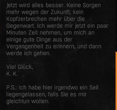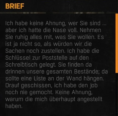 Der Brief des Filialleiters ist eine Nachricht in Dying Light: The Following. Sie liegt auf dem Bürotisch neben der hängenden Leiche des Chefs der Post. Sie wird nicht als sammelbares Objekt aufgenommen und kann jederzeit wieder gelesen werden.