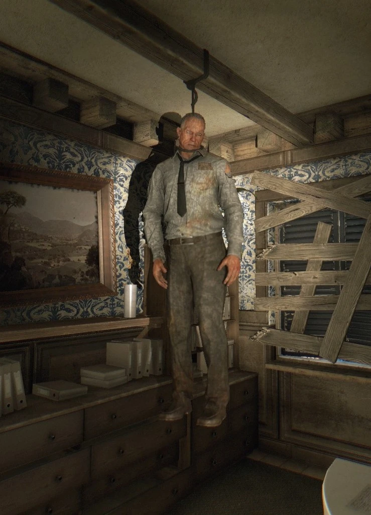 - Der Mann scheint schon etwas länger in seinem Gebäude zu hängen, da man bereits Verwesungserscheinungen an seinem Körper erkennen kann.