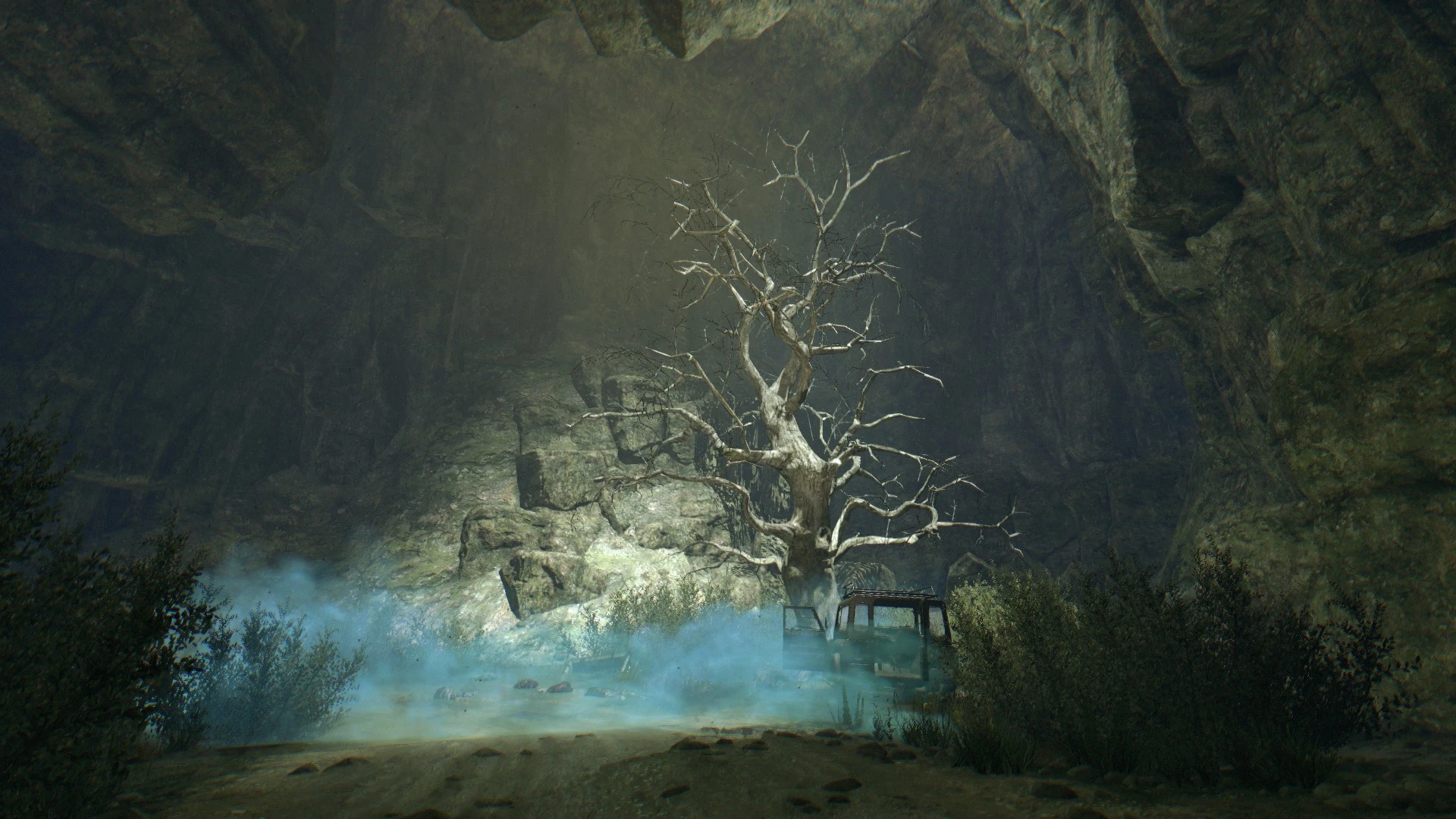 Der Anhänger des LKW und ein Jeep hatte eine große Ladung der Blauen Substanzen an Bord, welche bei dem Unfall fast völlig zerstört wurde. Die letzten intakten Phiolen wurden von Rais' Männern gestohlen. Man hört nun jedes mal den Hilferuf aus dem Anhänger, wenn man sich diesem nähert. Ein toter Soldat, welcher etwas abseits vom Jeep am Baum liegt, hat neben sich eine Fernbedienung mitsamt einem langen Kabel liegen, welches bis zur Schlucht reicht. Möglicherweise wurde vom Militär der Weg in der Höhle gesprengt um vor Verfolgern und Zombies sicher zu sein. Vermutlich hat diese Explosion durch die Erschütterung auch den Einsturz am Ende der Höhle verursacht.