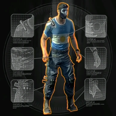 Kyle Crane wears a light blue T-shirt with a white stripe in the middle and a similarly colored collar. In the middle of said stripe is the image of the Sun of May, the same image present in the real flag of Argentina. He wears a pair of regular blue jeans with a loose belt while a pair of protective knee caps are secured around his knees. The shoes on this outfit have laces