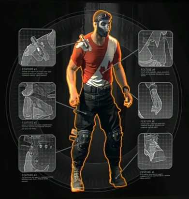 Kyle Crane wears a T-shirt with red lines travelling diagonally with one from the left side of his collar to his right hip while the other started from his left shoulder and ending on the symbol present. The middle said lines is solid white stripe with the red maple leaf in the middle. He wears a pair of black jeans with a loose belt while a pair of protective knee caps are secured around his knees. This outfit features shoes with laces