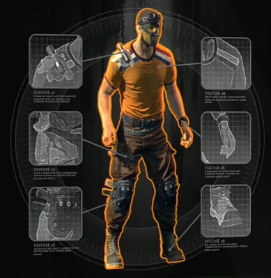 Kyle Crane wears a solid orange T-Shirt. Next on the left and right of his collar are depictions of the flag of Netherlands. He wears a pair of brown jeans with a loose belt while a pair of protective knee caps are clamped safely around the knees. The shoes on this outfit have laces