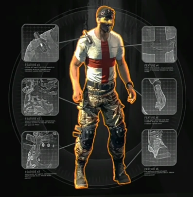Kyle Crane wears a white T-Shirt with 2 red stripes in the middle with one being vertical while the other being horizontal. He wears a pair of brown camouflage jeans with a loose belt with a pair of protective knee caps are clamped safely around his knees. He also wears shoes with laces