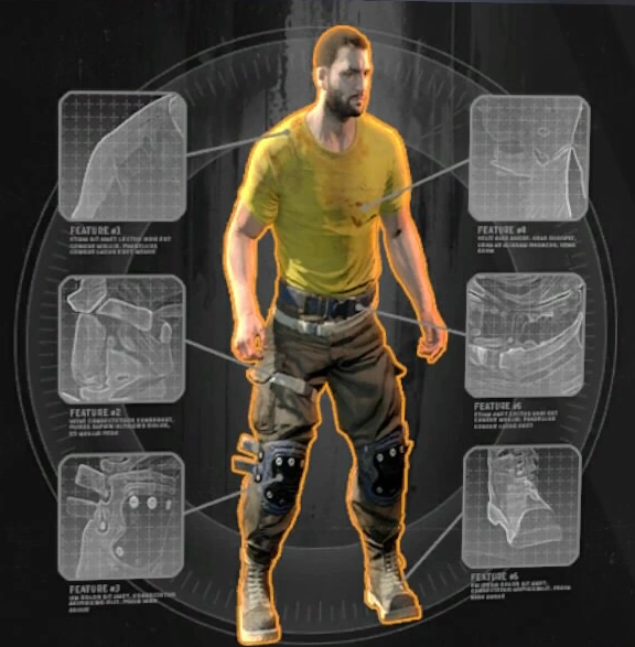 Kyle Crane wears a yellow T-Shirt with a design on the back resembling angel wings. On his knees are protective knee pads which are wrapped tightly against his baggy brown jeans. He's seen wearing lace up tactical boots with his pants tucked into the shaft. Above his white belt is a fanny pack clamped around his hip, presumably where his inventory is kept.