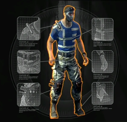 Kyle Crane wears a blue T-Shirt with a white cross on the upper right side of his shirt just below his white collar. A number of horizontal white stripes are placed in a descending manner, not overlapping the existent white cross. He wears a pair of green and white camouflage jeans with a loose belt hung below his hip while a pair of protective knee caps are clamped safely around the knees. This outfit also features shoes with laces