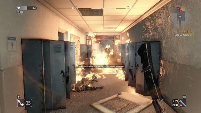 During the main quest line, Crane visits the school in a quest called Siblings; accompanied by Jade, they attempt to discover the reason why Rais' men are using the building as a base of operations. After killing several bandits, some of which carry weapons, they eventually descend into the basement of the school. They find numerous boxes which are full of ordinance and explosives; Jade realizes that Rahim will inevitably be interested in the explosives because he hopes to destroy the hive, a skyscraper full of volatiles. Instead, she takes the explosives to Sa'id to ensure that Rahim doesn't obtain them.