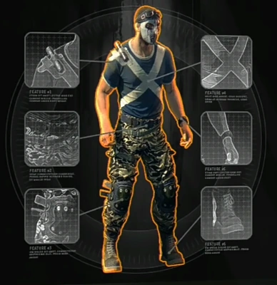 Kyle Crane wears a blue T-Shirt with 2 white stripes intersecting one another diagonally, forming an X shape. He wears a pair of black and green camouflage jeans with a loose belt while a pair of protective knee caps are clamped safely around the knees. The shoes on this outfit have laces