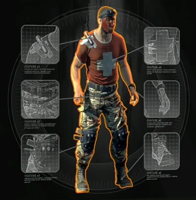Kyle Crane wears a solid red T-Shirt with a white "+" mark placed directly in the middle of the torso area. His collar is also colored white. He wears a pair of green, white, and brown camouflage jeans with a loose belt while a pair of protective knee caps are wrapped safely around his knees. This outfit also features shoes with laces