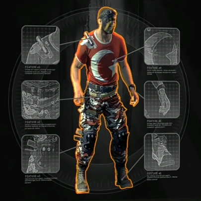 Kyle Crane wears a solid red T-Shirt with depictions of a white colored crescent moon and five point star next to each other in the torso area. He wears a pair of orange, white, and black camouflage jeans with a loose belt while a pair of protective knee caps are secured on his knees. Kyle also wears a pair of laced shoes on this outfit